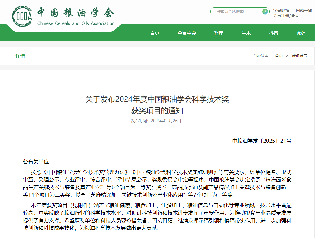 喜報|蘇州捷賽榮獲2024年度中國糧油學會科學技術(shù)獎!