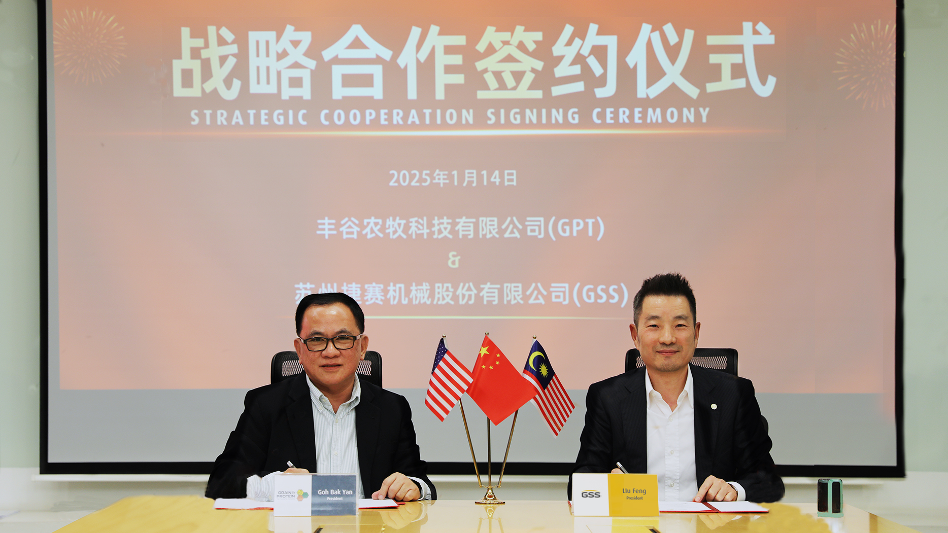 2025年1月14日,全球卓越的農(nóng)牧業(yè)解決方案領(lǐng)導(dǎo)者—GPT豐谷農(nóng)牧科技(Grain & Protein Technologies)與蘇州捷賽機(jī)械股份有限公司(GSS Systems)在蘇州捷賽總部正式簽署戰(zhàn)略合作協(xié)議。GPT豐谷農(nóng)牧科技亞太區(qū)總裁吳木鉛先生與蘇州捷賽總裁劉楓先生攜雙方團(tuán)隊(duì)代表出席簽約儀式,共同見(jiàn)證這一里程碑時(shí)刻!